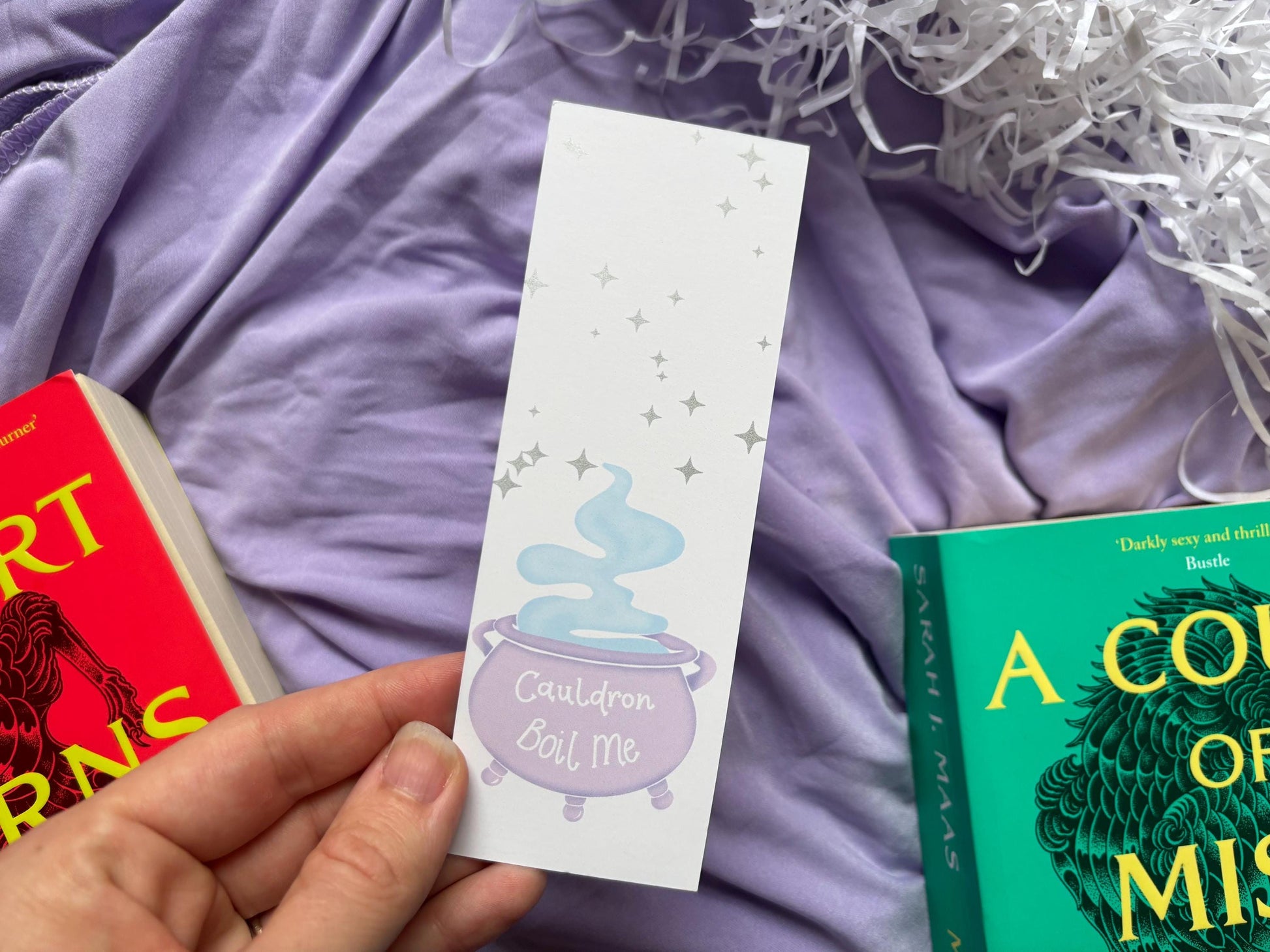 ✨ For the fae-loving, fantasy-obsessed readers who know exactly what the Cauldron has done… ✨ This lilac pastel bookmark is a playful yet magical nod to the ACOTAR universe — perfect for the romantasy reader who loves a little sparkle and a lot of sass. The front features a softly illustrated cauldron in gentle shades of lilac, releasing wisps of dreamy blue smoke. Floating above are scattered, silver metallic-effect sparkles that shimmer and catch the light — a subtle but striking detail that adds a magical touch. Across the front of the cauldron is the bold and cheeky phrase: “Cauldron Boil Me” - A nod to those steamy, chaotic, soul-binding moments ACOTAR readers know all too well. The reverse side keeps it simple with a zoomed-in version of the cauldron illustration (no sparkles or text), letting the dreamy design take centre stage.