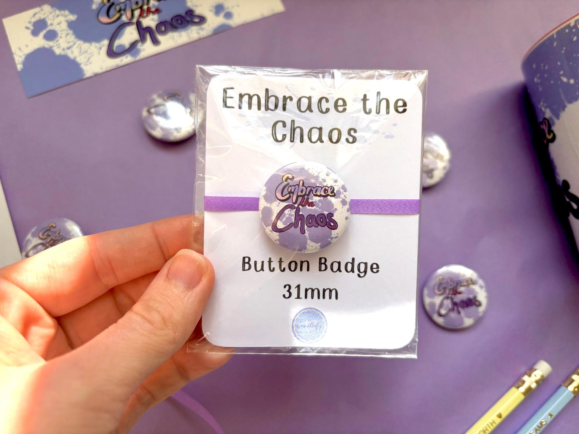Wear your chaos with pride. 💜 This 31mm round button badge is a small-but-mighty reminder that even in the whirlwind, you’re doing great. Featuring the soft lilac paint-splattered design and the hand-lettered quote “Embrace the Chaos,” it’s perfect for pinning to a tote, jacket, or nappy bag. ✨
