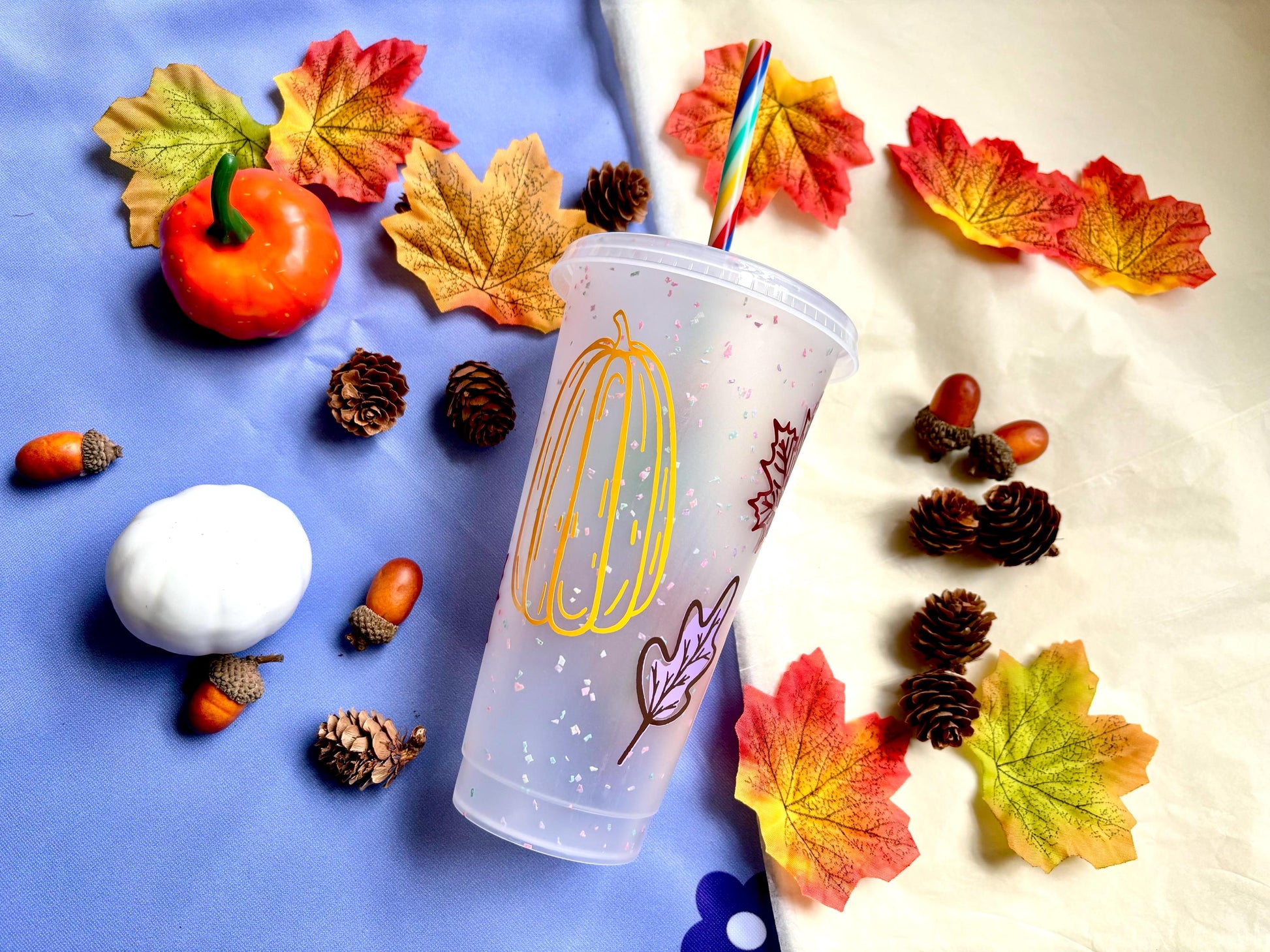 Celebrate the magic of fall with our 24oz colour-changing confetti cold cup, designed to bring an extra touch of autumn to your favourite iced beverages! Featuring an exclusive hand-illustrated pattern of pumpkins and vibrant fall leaves, each cup is made with high-quality permanent vinyl for a unique, artisanal touch. As you sip, watch the confetti details transform with temperature — a fun colour-changing effect that makes every drink feel festive! This seasonal cup is perfect for cold drinks on those crisp Autumn mornings or while enjoying an iced coffee on a sunny afternoon.