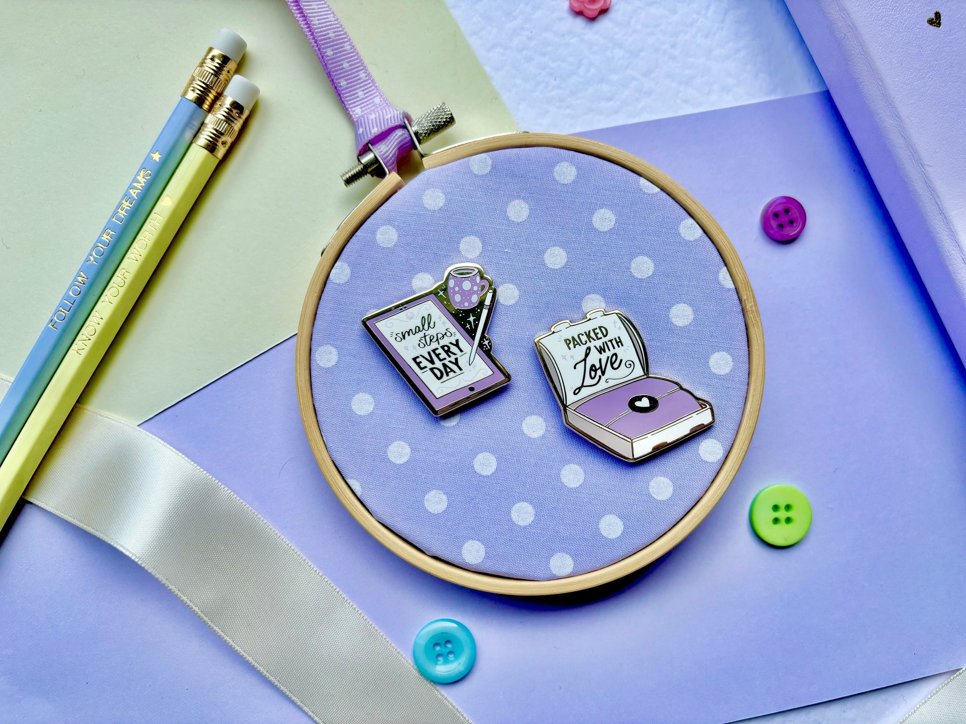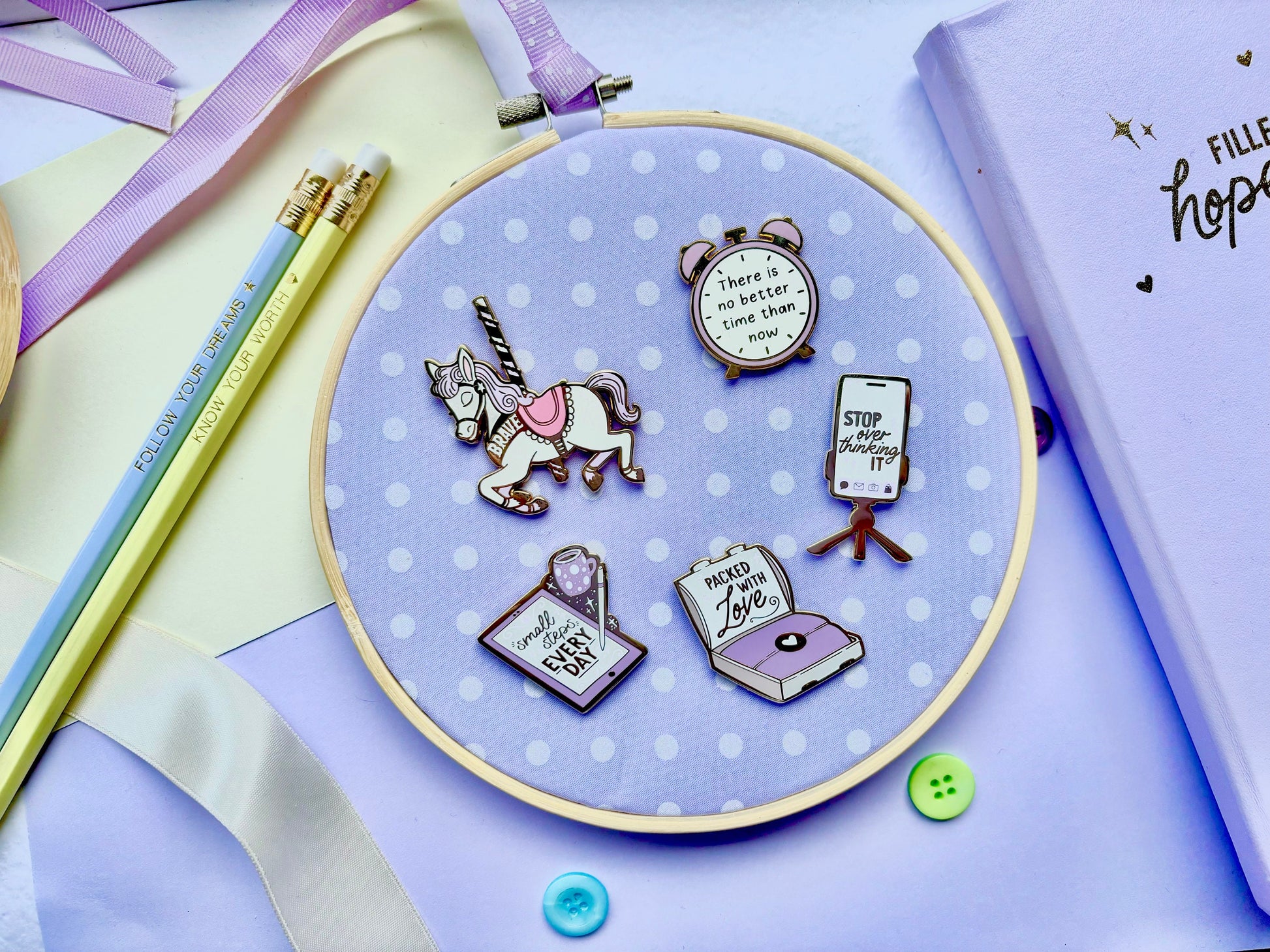 The pin badges featured in the image are NOT included with your hoop display! They are by some incredible small businesses including: - Emily Harvey Art - Dellies Designs