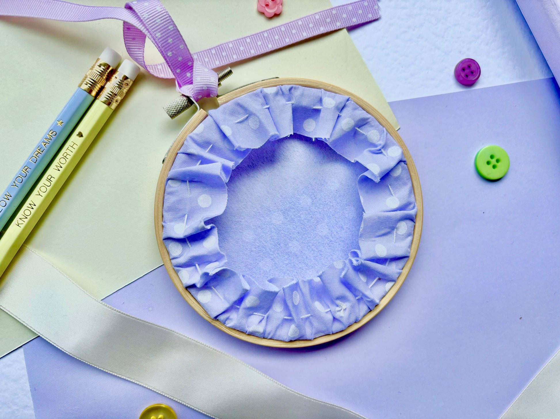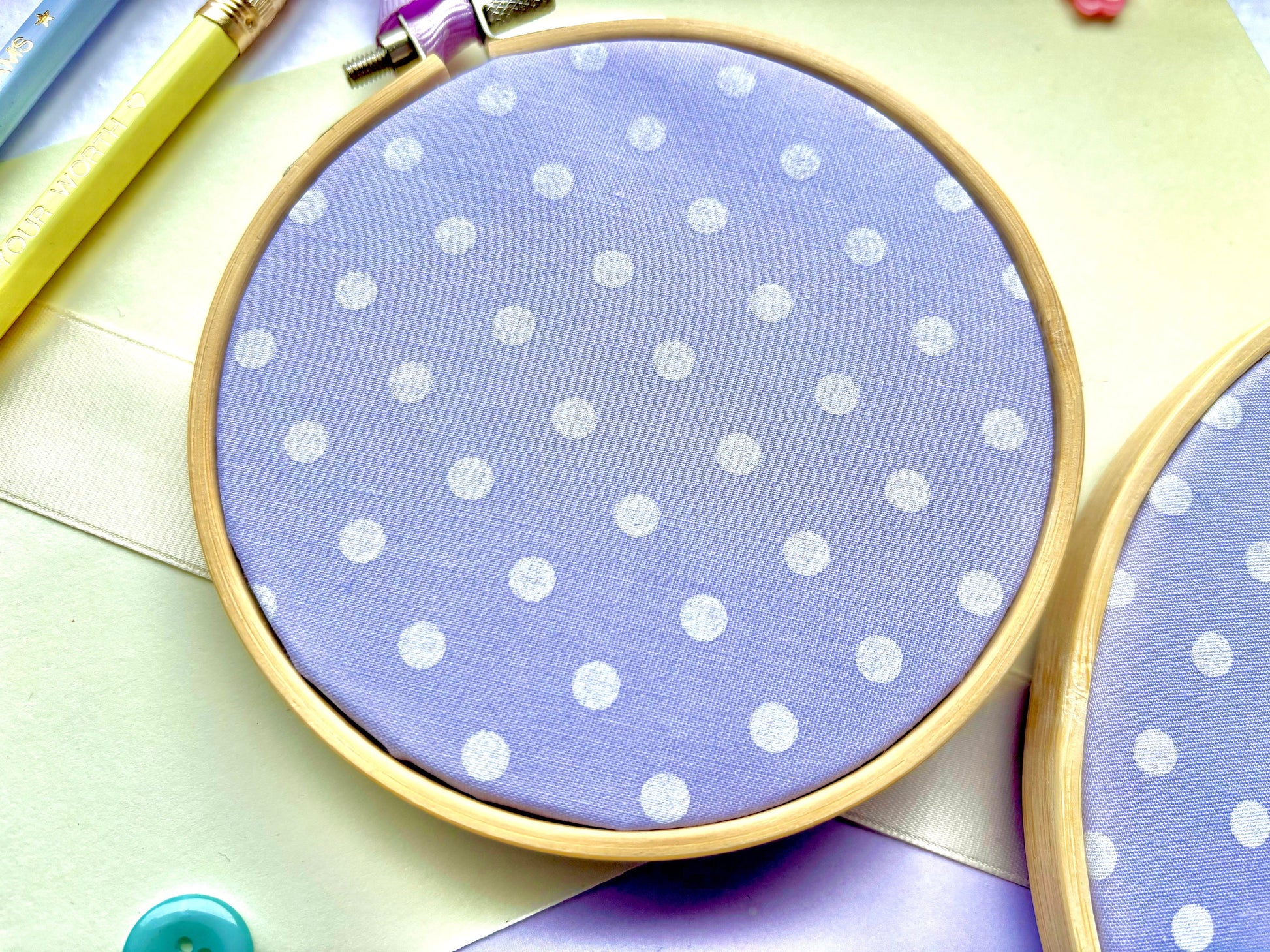 Made with wooden embroidery hoop, lilac polycotton polka dot fabric, white heavyweight iron on interfacing and lilac polka dot ribbon.