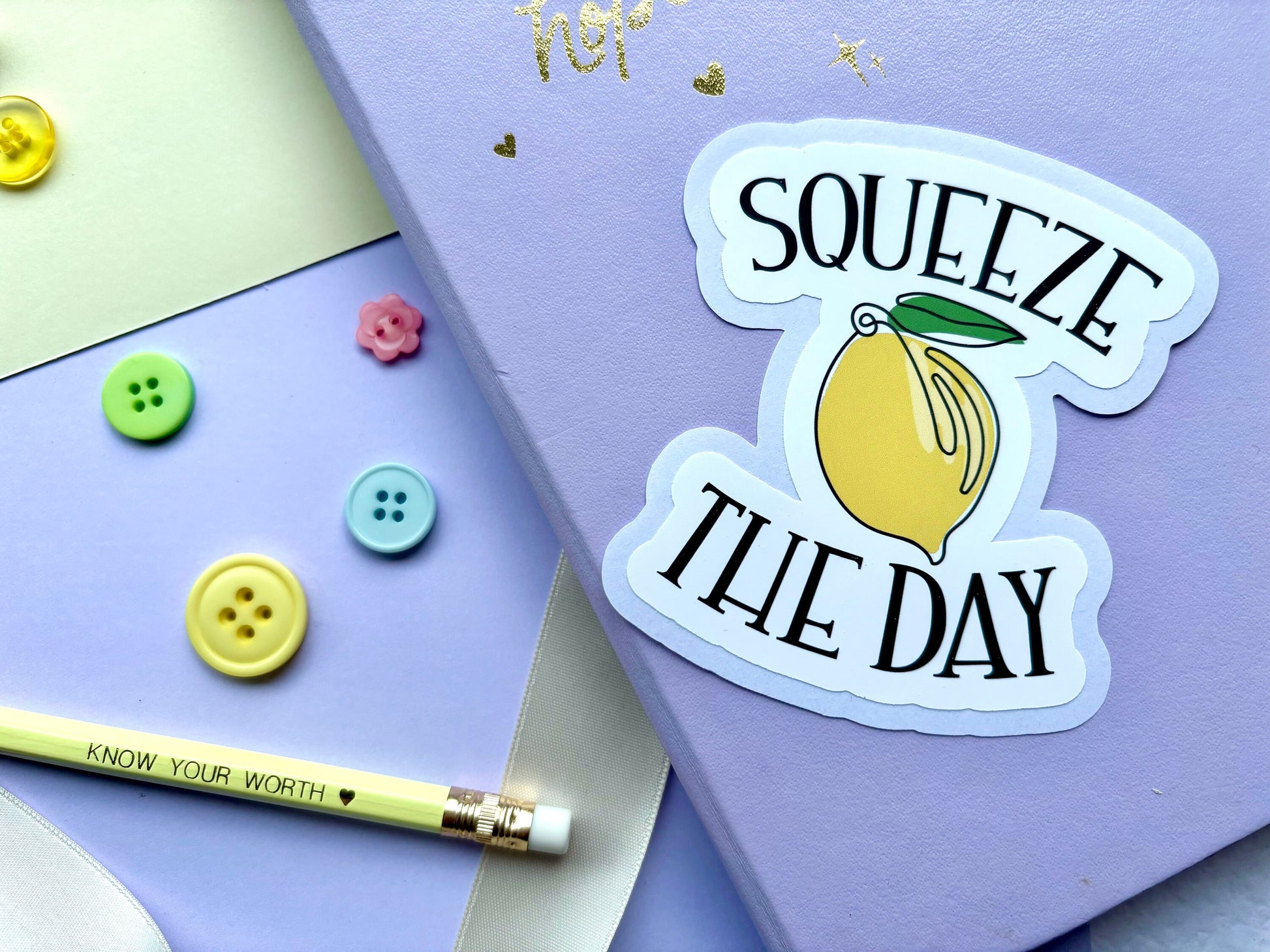 Add a touch of positivity to your belongings with this Squeeze The Day Lemon Die-Cut Vinyl Sticker! Featuring a vibrant lemon surrounded by a quirky pun, this sticker is a perfect reminder to make the most of everyday.